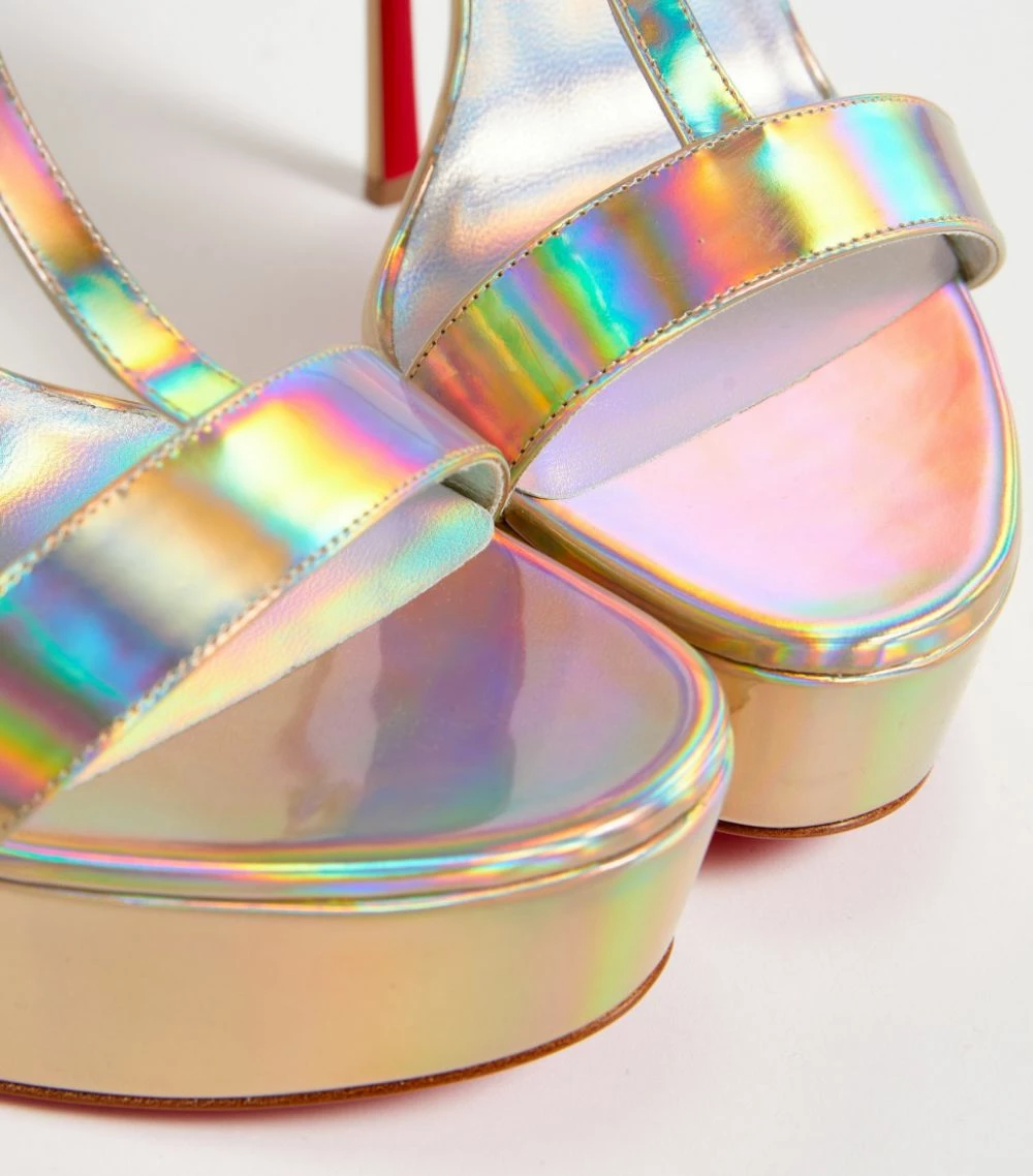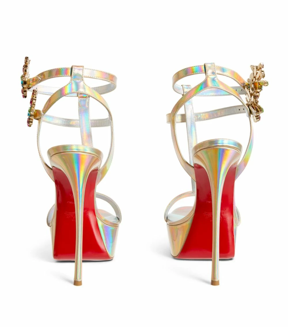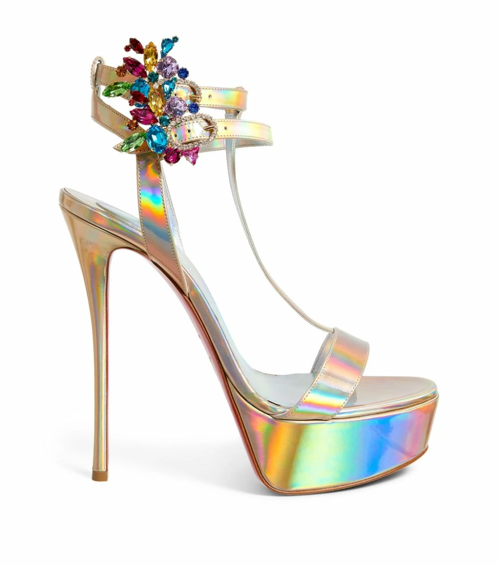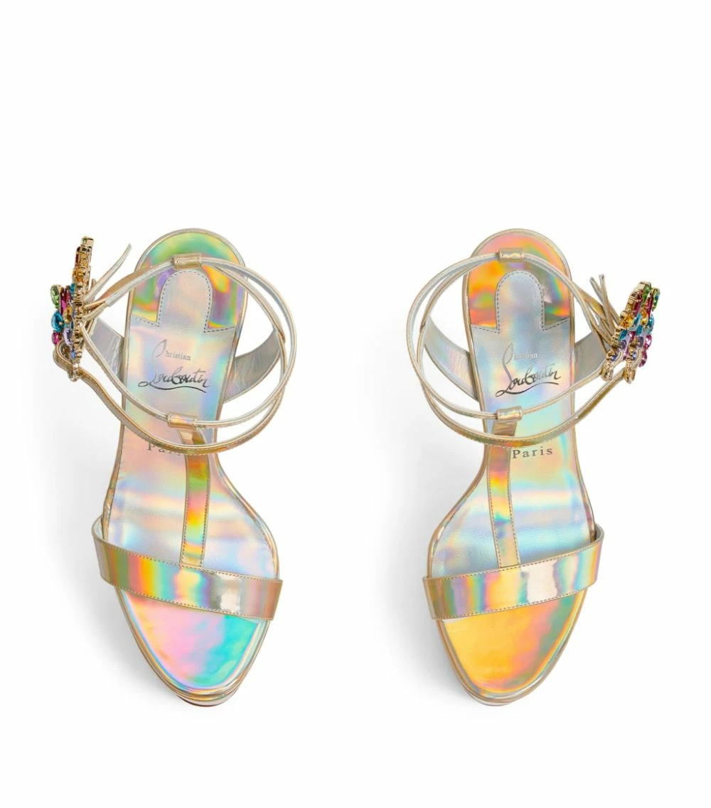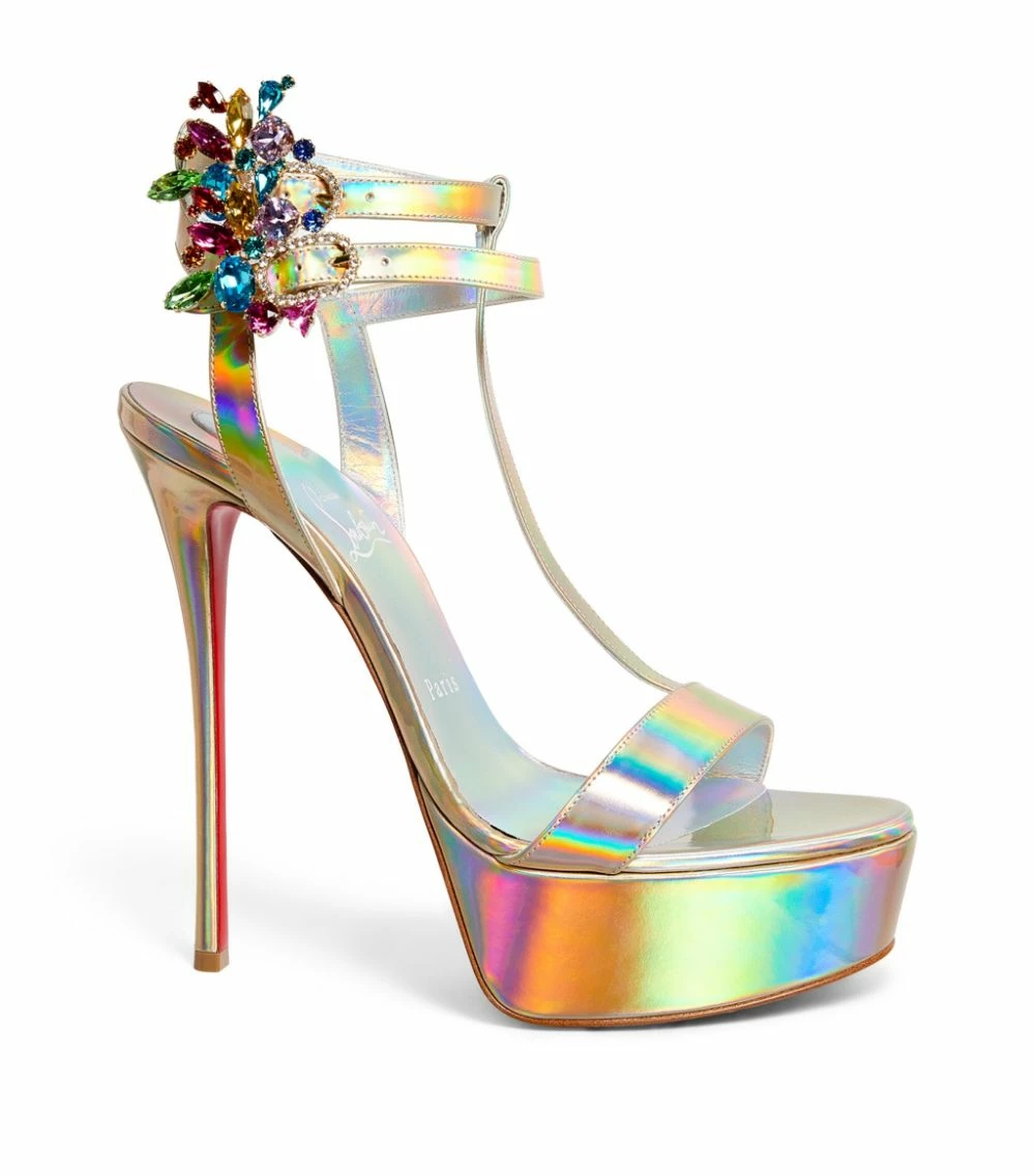If you’re looking for a heel to capture the room, look no further than Christian Louboutin’s Mara Joli Alta sandals. If towering above the competition on a stiletto heel wasn’t enough, they boast a patent leather composition that reflects the spotlight with its mesmerising iridescent effect. Finished with a double ankle strap, they’re embellished with a multicoloured crystal cluster that echoes the avant-garde aesthetic of costume jewellery.Please note, Christian Louboutin’s signature red lacquered soles will wear out when tried on a hard surface other than carpet; this is normal wear and tear and is not considered to be a manufacturing defect. Please try these shoes on a carpeted surface, as any damage to the soles may prevent us from accepting returns.