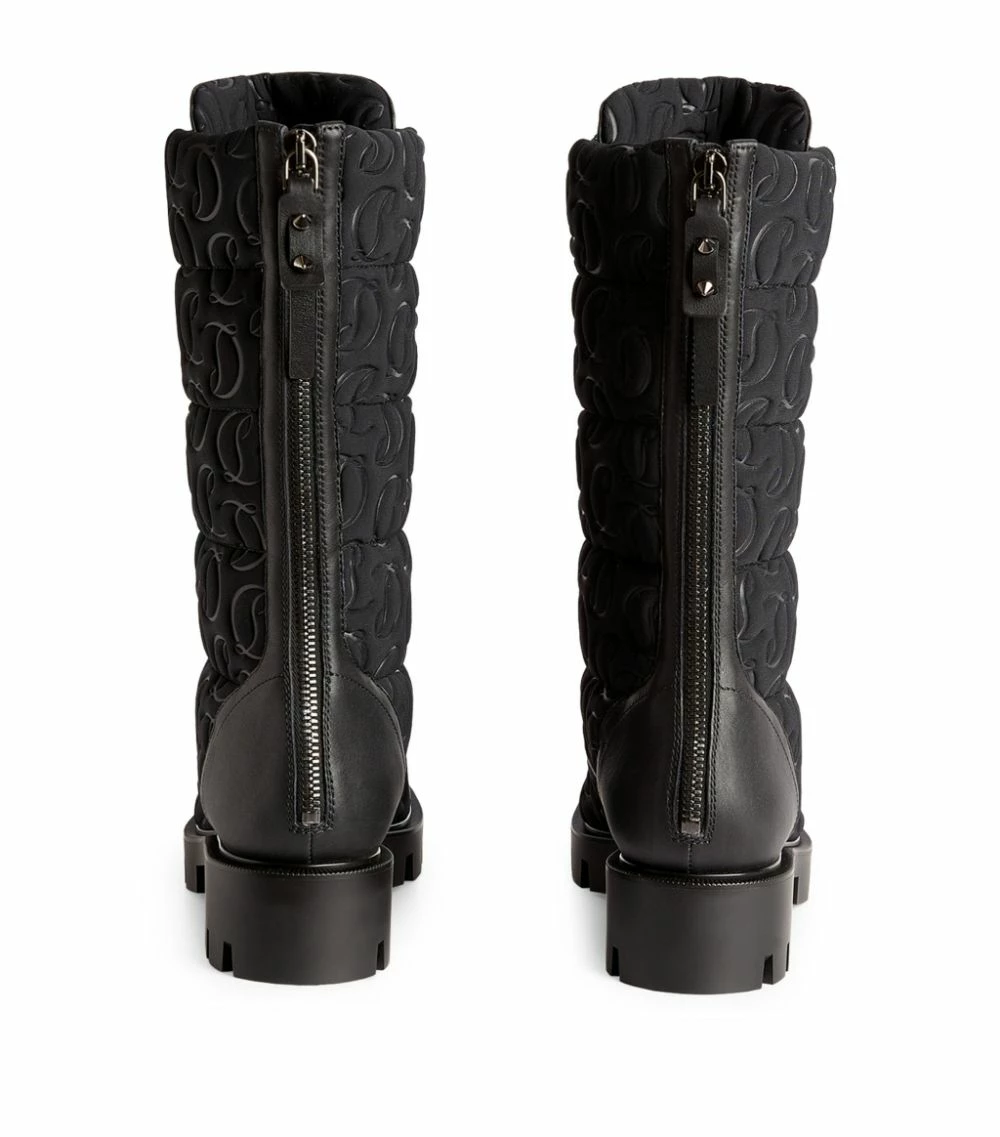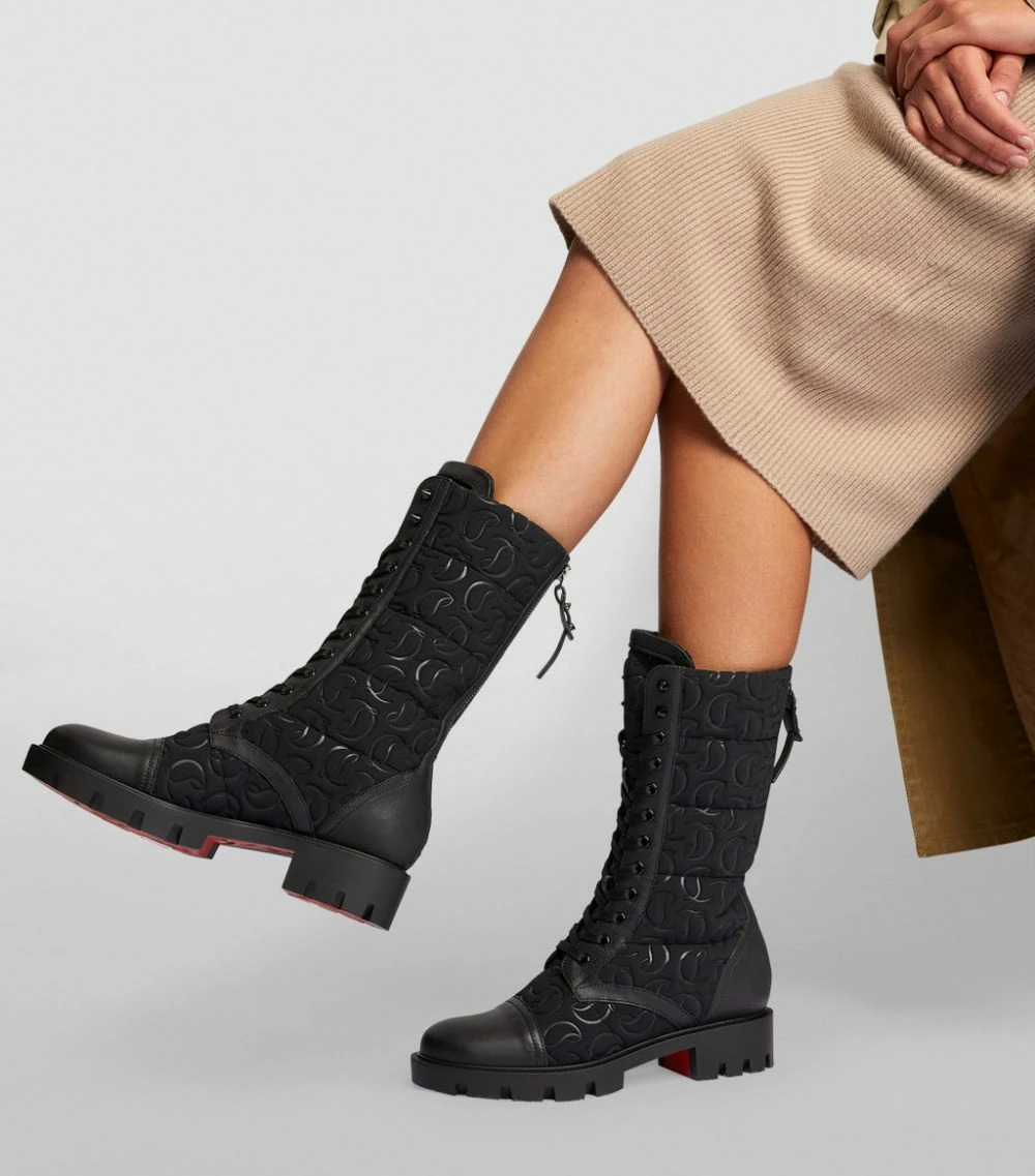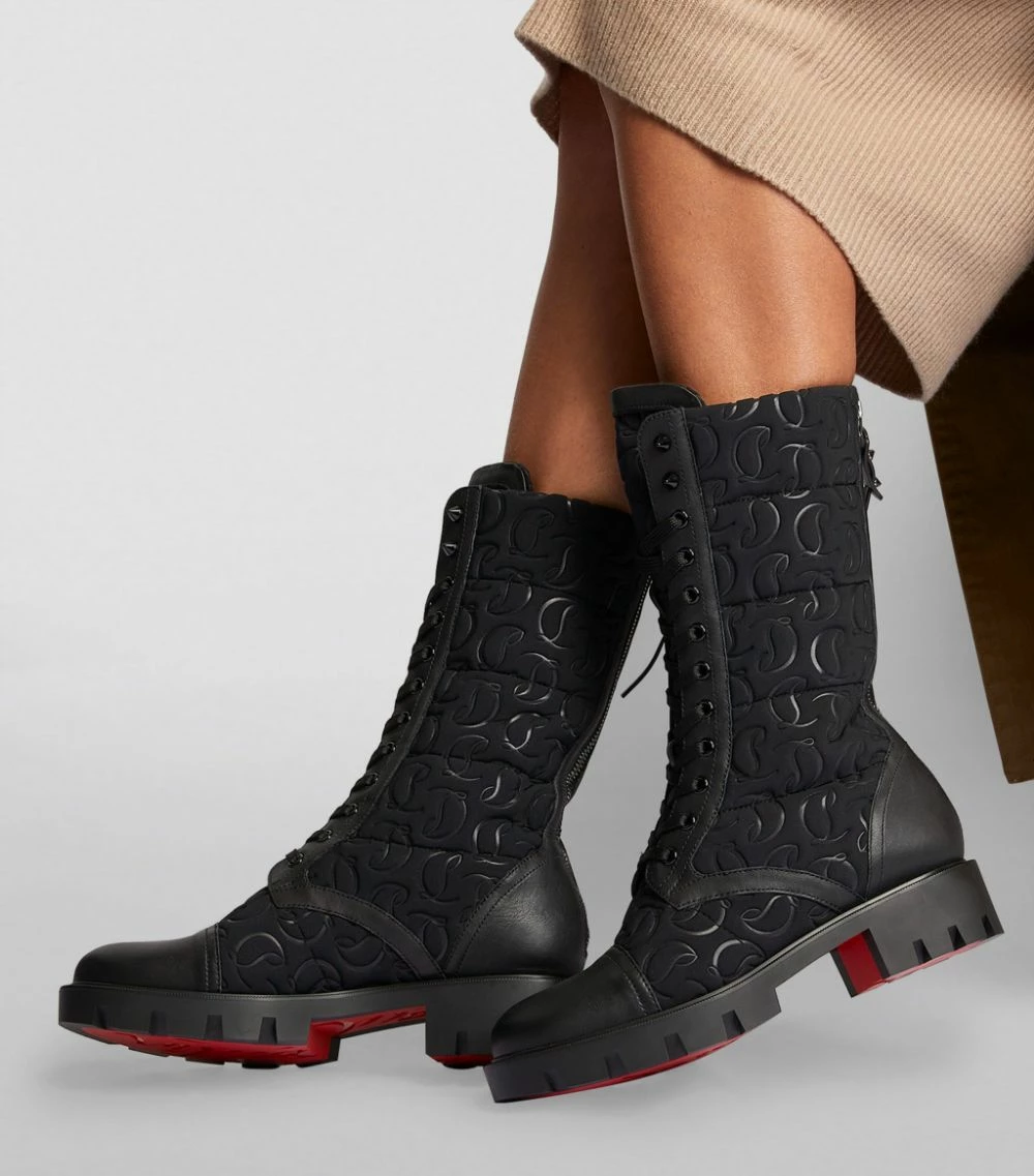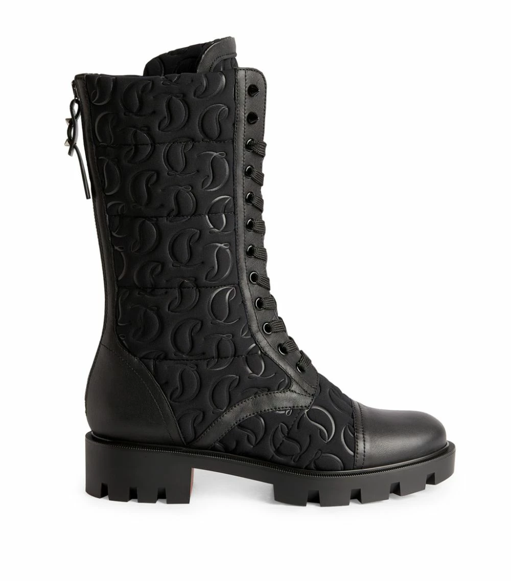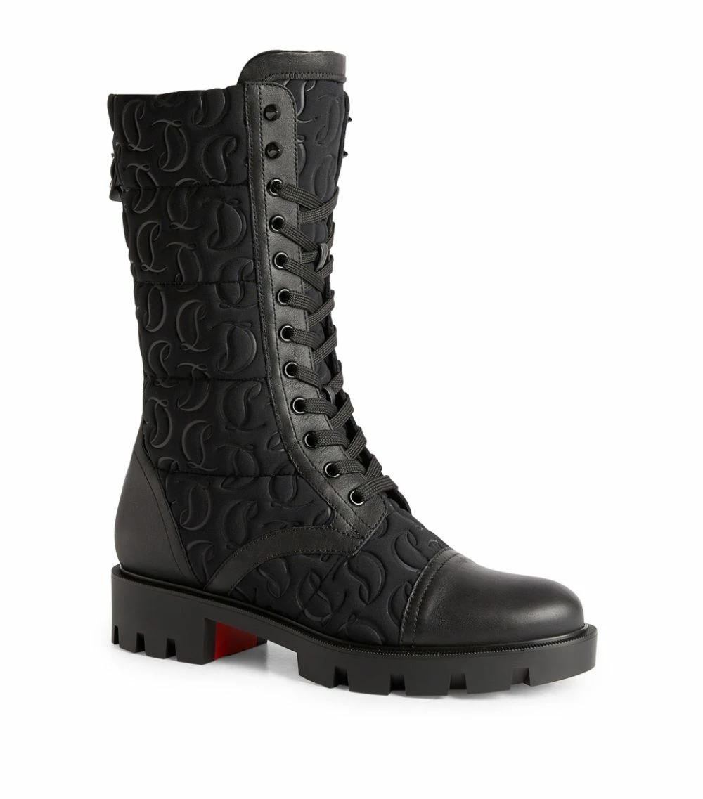 Drawing inspiration from the biker subculture, the Pavleta combat boots from Christian Louboutin showcase a clean, sturdy silhouette reimagined with contrasting leather trims and a striking lace-up fastening. The sleek calfskin leather upper is embellished with the House’s iconic monogram and signature black and silver spikes for a daring yet distinguished look.