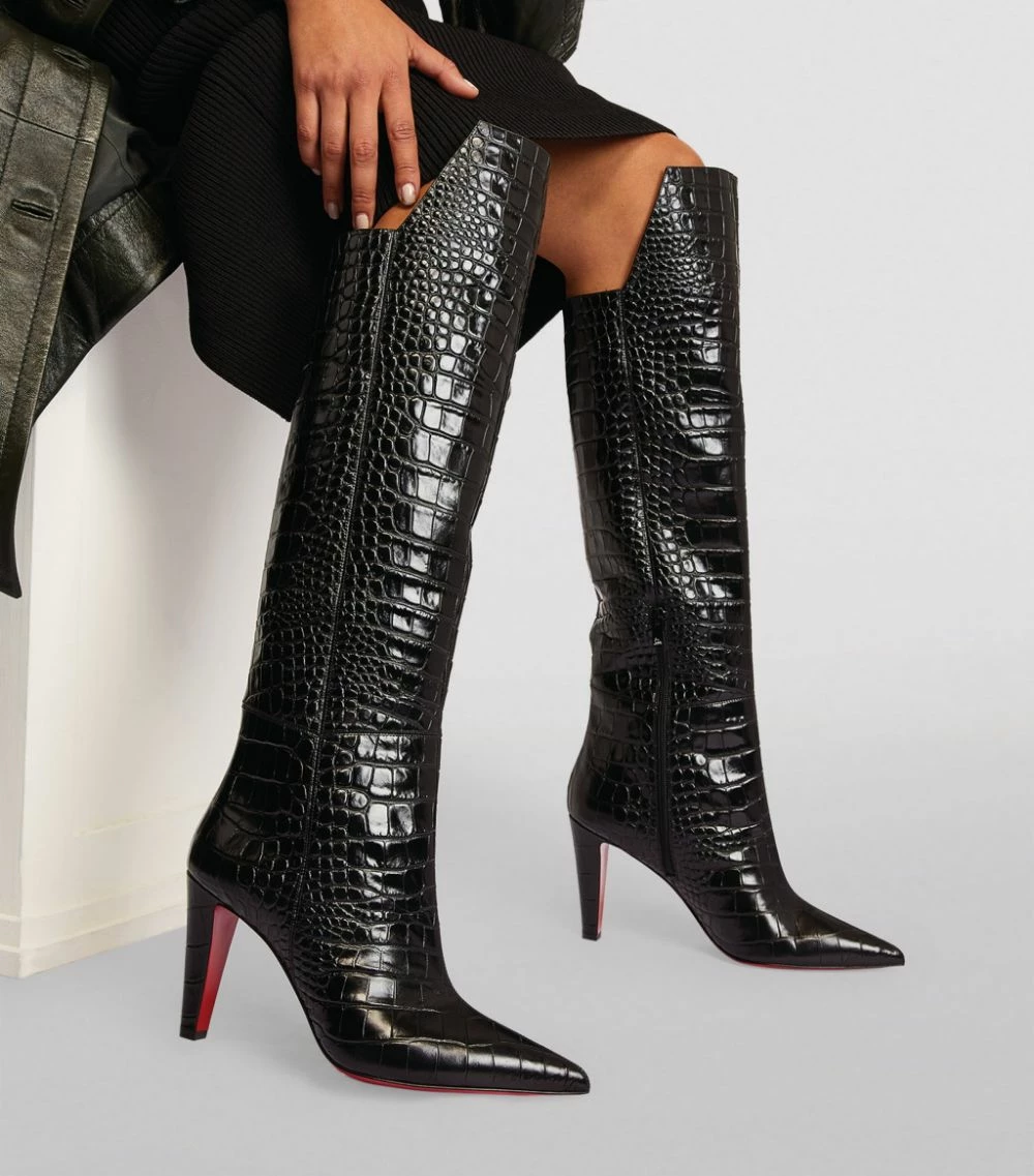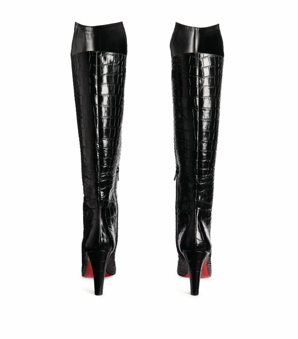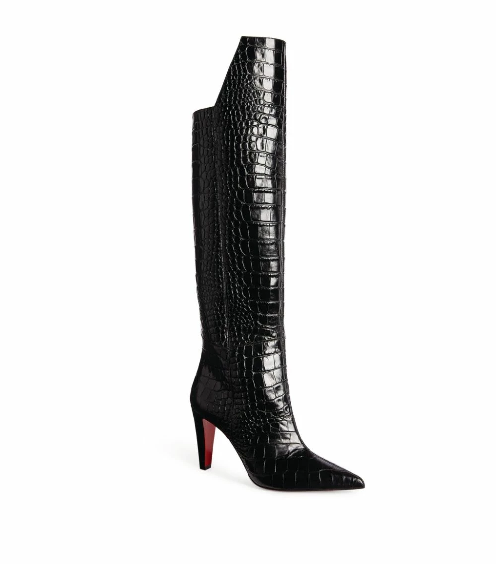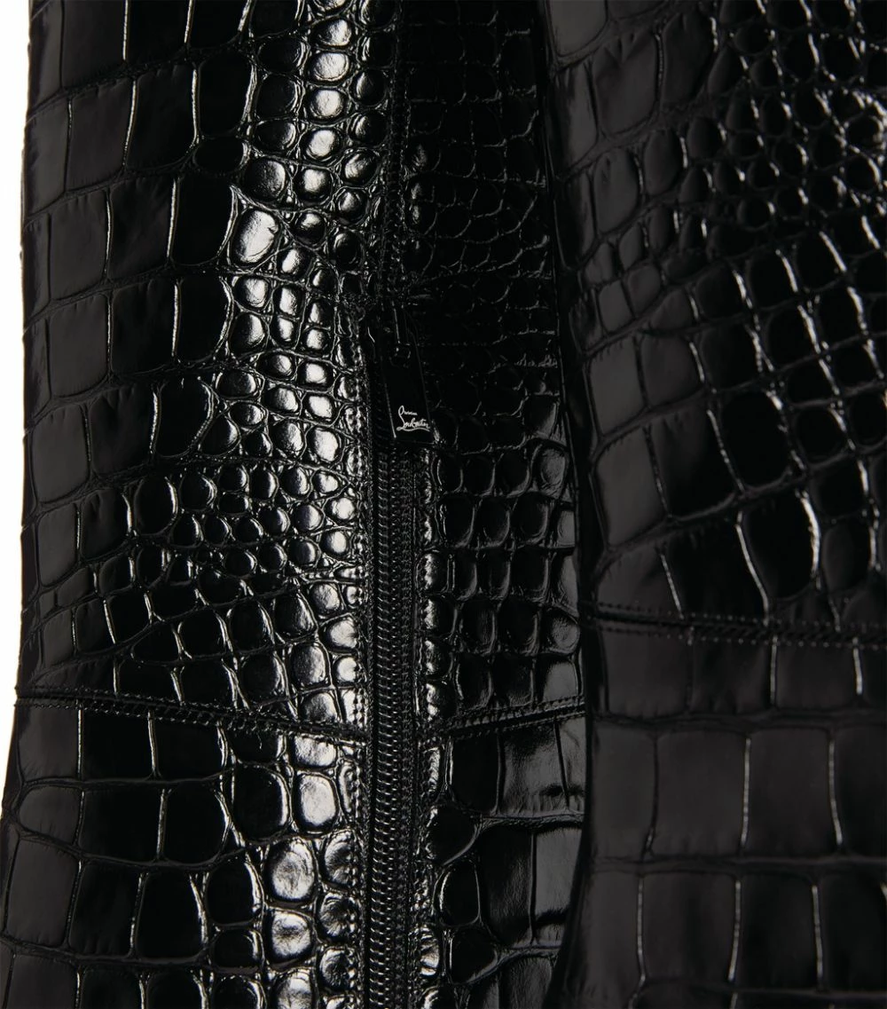 Defined by their smooth lines, Christian Louboutin’s Slimini Botta boots offer a contemporary re-working of the classic knee-high silhouette. Crafted from luxurious calfskin leather with an embossed mock crocodile effect, the pair exudes a decidedly retro feel, while the rounded toe and asymmetric knee brace signify the Parisian label’s firm contemporary footing.